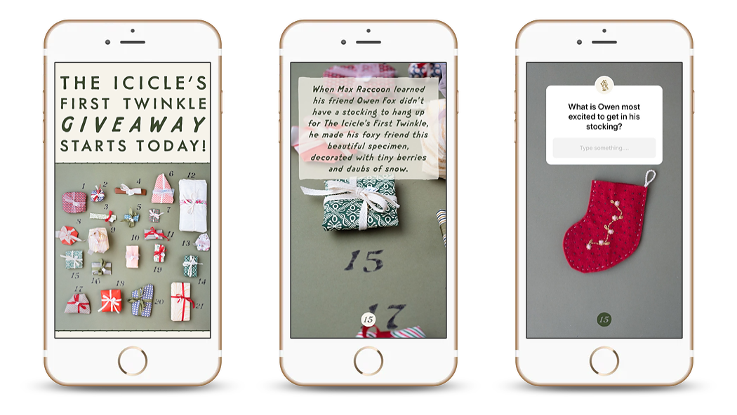 A 21-day Instagram Stories giveaway series featuring one-of-a-kind handmade gifts from Hazel Village animals. Each day revealed a new item, with interactive prompts that encouraged followers to answer questions for a chance to win.